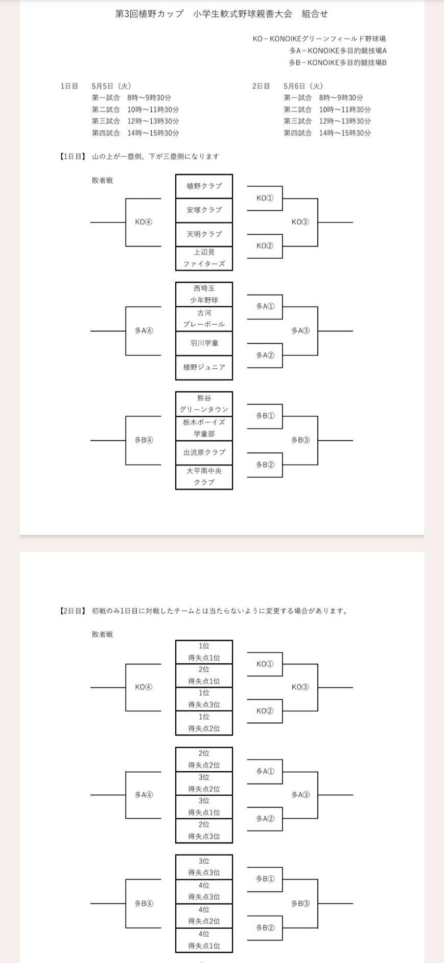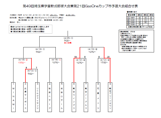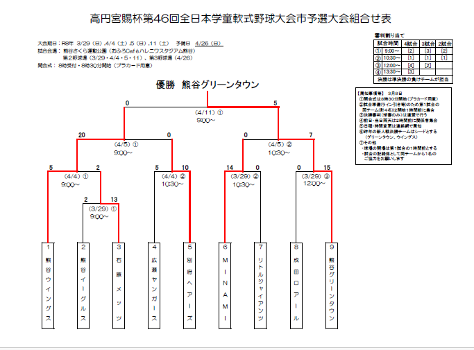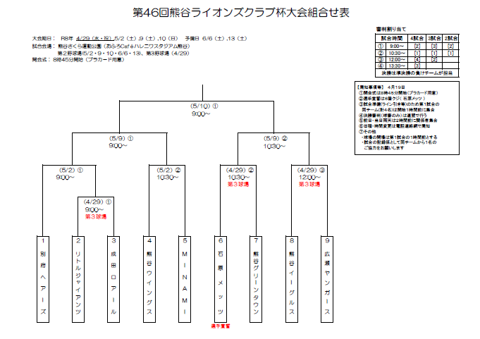 高円宮杯第46回全日本学童軟式野球大会 埼玉県予選会 第40回読売旗争奪県北少年野球大会 熊谷市予選 第3回植野カップ 第46回熊谷ライオンズクラブ杯 第49回埼玉県学童軟式野球大会兼第21回GasOneカップ 熊谷市予選 高円宮杯第46回全日本学童軟式野球大会 熊谷市予選 第13回小鹿野スプリングカップ少年野球大会 フィールドフォーストーナメント2026 めざせ!愛媛・スポ少2026 2DAYs IN SUITA 第2回武蔵嵐山カップ学童野球交流練習会