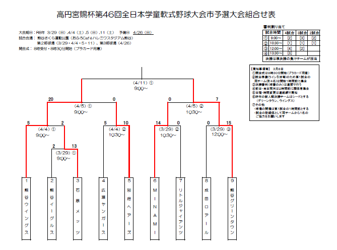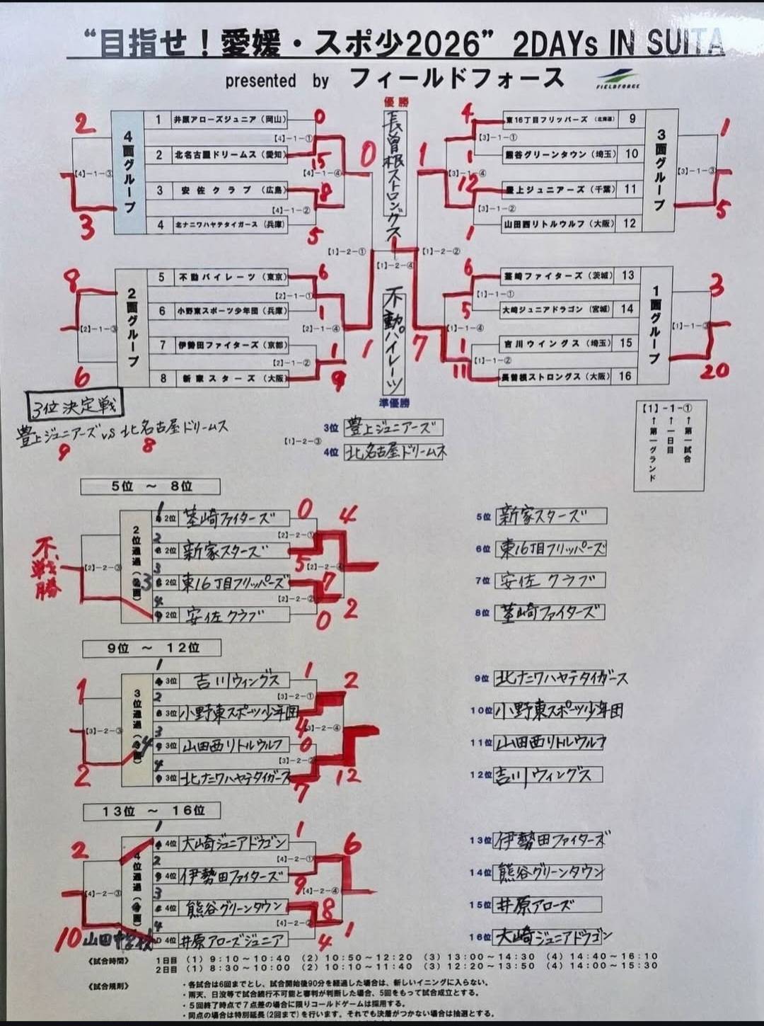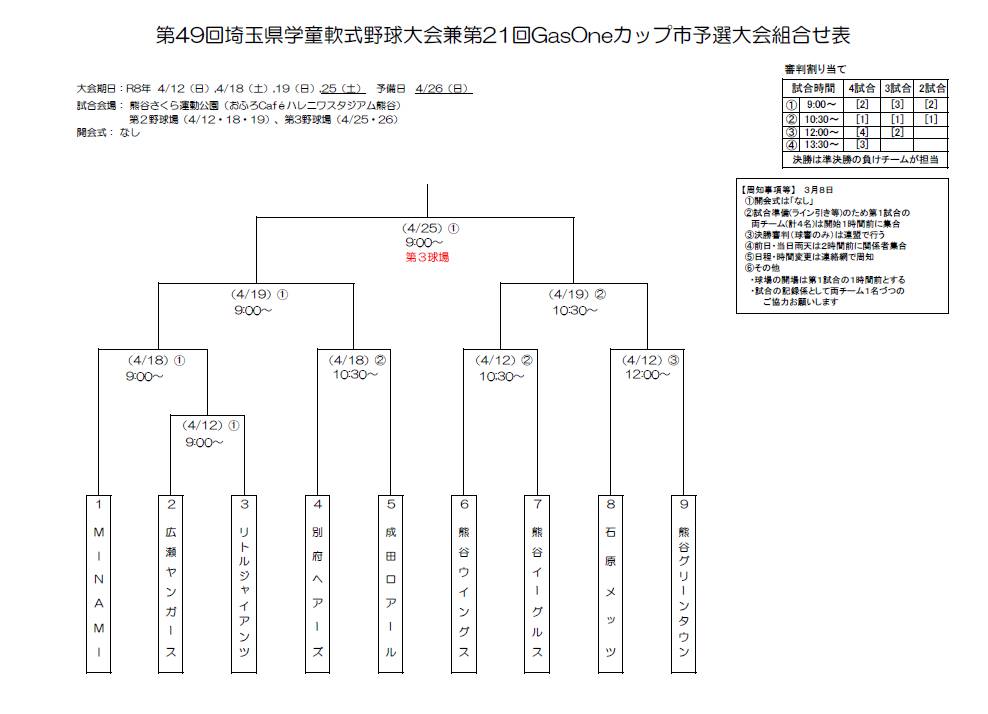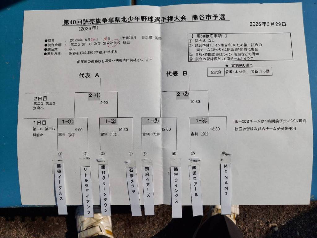 第40回読売旗争奪県北少年野球大会 熊谷市予選 第49回埼玉県学童軟式野球大会兼第21回GasOneカップ 熊谷市予選 高円宮杯第46回全日本学童軟式野球大会 熊谷市予選 第13回小鹿野スプリングカップ少年野球大会 フィールドフォーストーナメント2026 めざせ!愛媛・スポ少2026 2DAYs IN SUITA 第2回武蔵嵐山カップ学童野球交流練習会